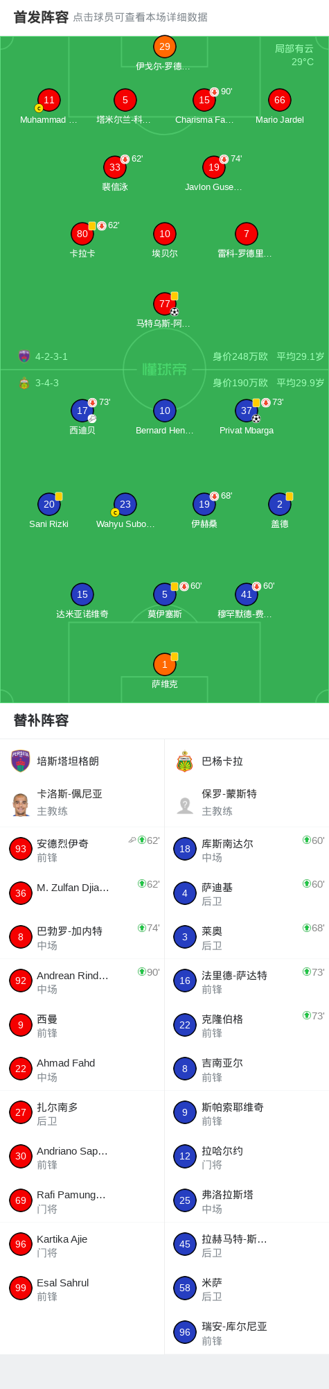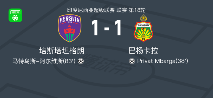 北京时间1月24日,印度尼西亚超级联赛第18轮,培斯塔坦格朗主场对阵巴杨卡拉。西迪贝送出助攻,Privat Mbarga破门得分;随后安德烈伊奇送出助攻,马特乌斯-阿尔维斯破门得分。最终双方1比1战平。