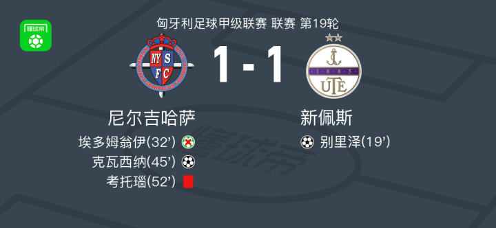 北京时间1月24日,匈牙利足球甲级联赛第19轮,尼尔吉哈萨主场对阵新佩斯。新佩斯由别里泽破门得分;随后尼尔吉哈萨由克瓦西纳破门扳平比分。比赛中,尼尔吉哈萨球员埃多姆翁伊主罚点球未能命中,球队球员考托瑙被直接罚令出场。最终双方1比1战平。
