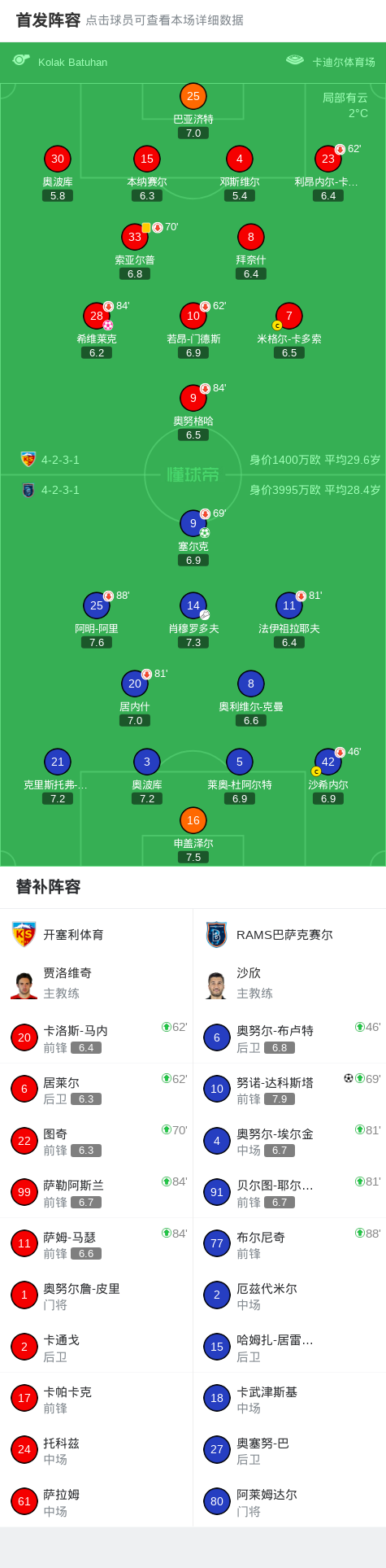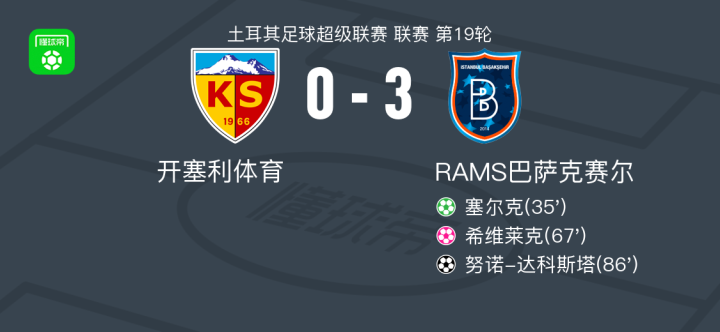 北京时间1月24日,土耳其足球超级联赛第19轮,开塞利体育主场对阵RAMS巴萨克赛尔。比赛中,RAMS巴萨克赛尔球员塞尔克罚入点球;随后,开塞利体育球员希维莱克不慎自摆乌龙;终场阶段,RAMS巴萨克赛尔球员努诺-达科斯塔破门得分。最终,开塞利体育0–3不敌RAMS巴萨克赛尔。