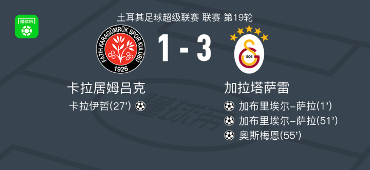 土耳其足球超级联赛第19轮,卡拉居姆吕克主场对阵加拉塔萨雷。加布里埃尔-萨拉率先破门,卡拉伊哲随后为主队扳平比分。加布里埃尔-萨拉再度建功,奥斯梅恩锦上添花。最终,卡拉居姆吕克1比3不敌加拉塔萨雷。