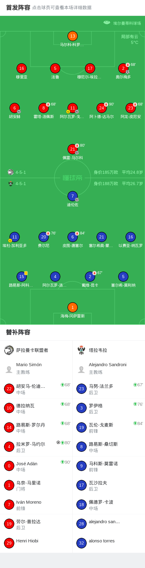 北京时间1月25日,西班牙皇家足协甲组联赛A组第21轮,萨拉曼卡联盟者主场对阵塔拉韦拉。奥尔梅多率先破门,随后佩雷-马尔科扩大比分,胡安赫再入一球,阿尔瓦罗-戈麦斯锦上添花。迪伦佐为塔拉韦拉扳回一城,补时阶段拉米罗-马约尔破门锁定胜局。最终萨拉曼卡联盟者5比1战胜塔拉韦拉。