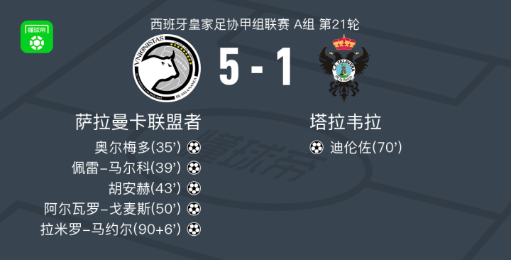 萨拉曼卡联盟者5-1大胜塔拉韦拉,拉米罗-马约尔破门,阿尔瓦罗-戈麦斯建功