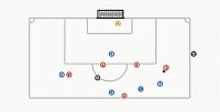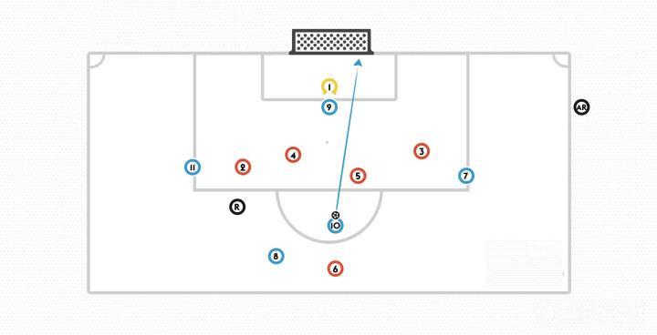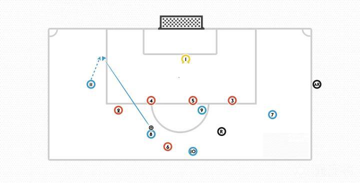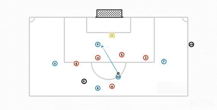 如果以上场景中的蓝色9号是在6码区的角上,并没有挡住守门员的视线,那么它就不会被判越位犯规,进球有效。
