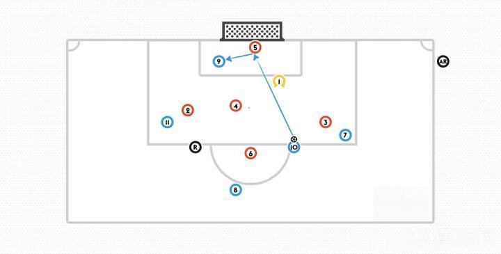 除此之外,如果球被5号从球门中救出,反弹到了处于越位位置的对手9号脚下(非故意传给9号),9号因此获利,这也属于越位。