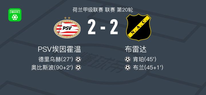 北京时间1月25日,荷兰甲级联赛第20轮,PSV埃因霍温主场对阵布雷达。德里乌赫接队友助攻破门,为PSV埃因霍温首开纪录;随后肯珀破门,为布雷达扳平比分;上半场补时阶段,布兰再入一球,助布雷达反超;下半场补时阶段,奥比斯波破门,为PSV埃因霍温再度追平。最终双方2比2战平。