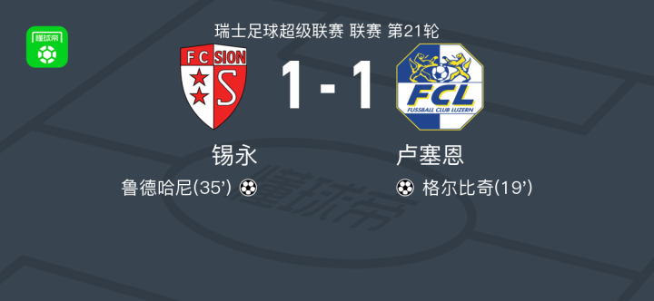 北京时间1月25日,瑞士足球超级联赛第21轮,锡永主场对阵卢塞恩。冯莫斯送出助攻,格尔比奇破门得分;随后巴尔塔扎尔送出助攻,鲁德哈尼破门得分。最终双方1比1战平。