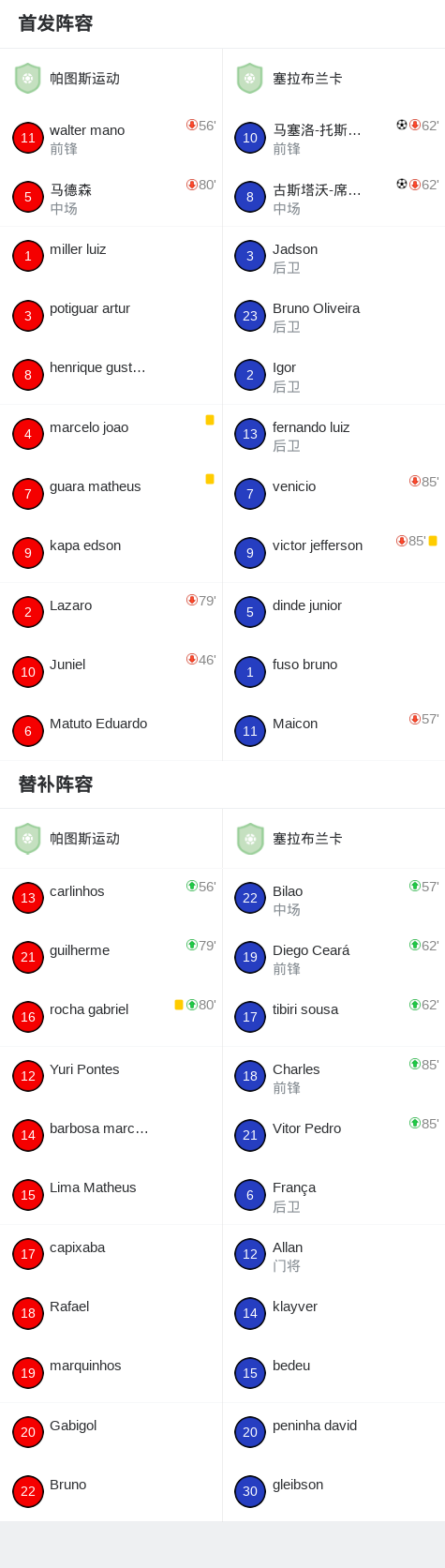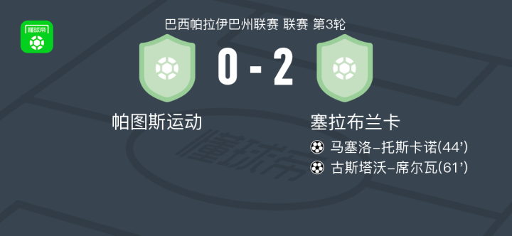 北京时间1月25日,巴西帕拉伊巴州联赛第三轮,帕图斯运动主场对阵塞拉布兰卡。马塞洛-托斯卡诺率先破门,随后古斯塔沃-席尔瓦再入一球。最终,塞拉布兰卡以2比0取胜。