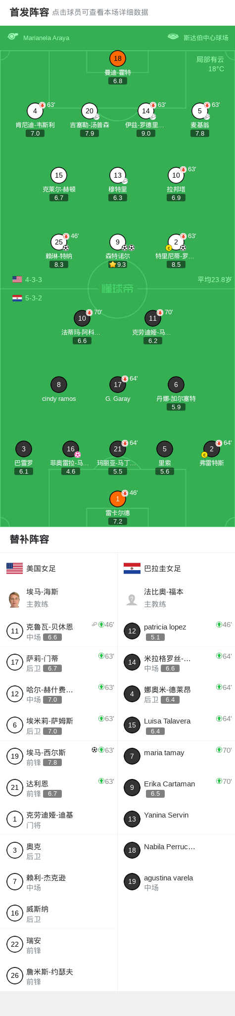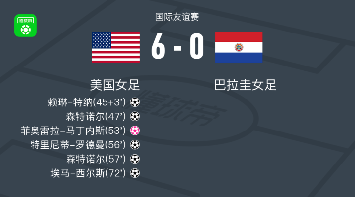 美国女足6-0狂胜巴拉圭女足,森特诺尔两球,埃马-西尔斯建功