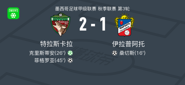 北京时间1月25日,墨西哥足球甲级联赛秋季联赛第3轮,特拉斯卡拉主场对阵伊拉普阿托。伊拉普阿托由桑切斯率先破门;随后克里斯蒂安主罚点球命中,为特拉斯卡拉扳平比分;上半场临近结束前,克里斯蒂安送出助攻,菲格罗亚破门得分。最终特拉斯卡拉以2比1战胜伊拉普阿托。