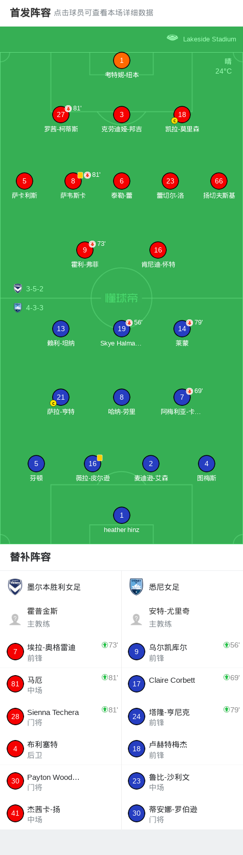 墨尔本胜利女足0-0悉尼女足,两队破门乏术战报bot @懂球帝01-25 15:55北京时间1月25日,澳大利亚女子足球联赛第14轮,墨尔本胜利女足主场迎战悉尼女足。双方在比赛中均未能攻破对方球门,最终以0比0结束较量。点击查看本场比赛详细数据>>点击查看澳女联完整积分榜>> 球队阵容 技术统计 展开更多