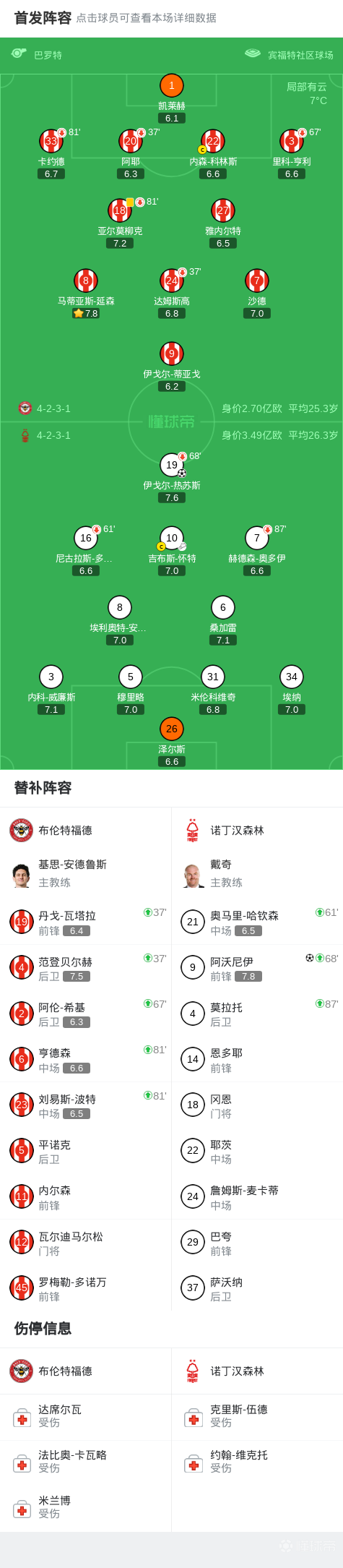 布伦特福德0-2诺丁汉森林,热苏斯、阿沃尼伊破门