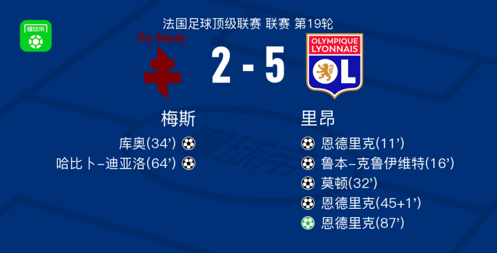 北京时间1月26日,法国足球顶级联赛第19轮,梅斯主场对阵里昂。比赛开始后,恩德里克率先破门,随后鲁本-克鲁伊维特再入一球。莫顿随即扩大比分,库奥为梅斯扳回一城。上半场补时阶段,莫顿送出助攻,恩德里克再度得分。下半场,库奥助攻哈比卜-迪亚洛破门。比赛尾声,恩德里克主罚点球命中。最终,梅斯2比5不敌里昂。