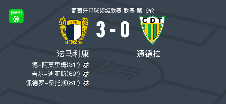 葡萄牙足球超级联赛第19轮,法马利康主场对阵通德拉。埃利索尔送出助攻,德-阿莫里姆破门得分;随后吉尔-迪亚斯破门扩大优势;佩德罗-桑托斯再入一球锁定胜局。最终法马利康以3比0战胜通德拉。