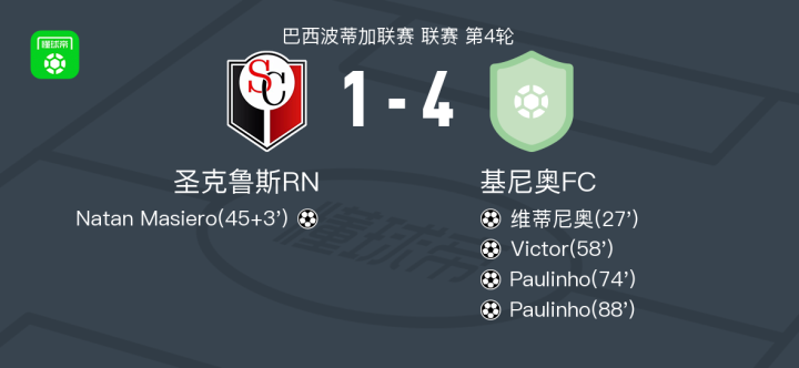 巴西波蒂加联赛第4轮,圣克鲁斯RN主场对阵基尼奥FC。维蒂尼奥率先破门,随后Natan Masiero为圣克鲁斯RN扳回一球。Victor扩大基尼奥FC领先优势,Paulinho随后连入两球。最终,圣克鲁斯RN以1比4不敌基尼奥FC。