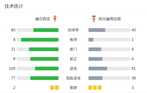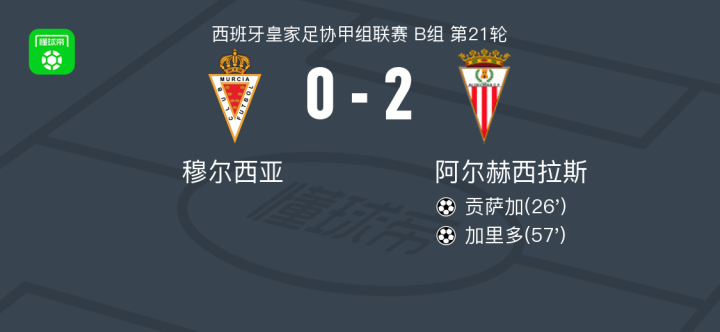 北京时间1月26日,西班牙皇家足协甲组联赛B组第21轮,穆尔西亚主场对阵阿尔赫西拉斯。贡萨加率先破门,随后加里多再入一球。最终,穆尔西亚0–2不敌阿尔赫西拉斯。
