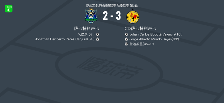 萨尔瓦多足球超级联赛秋季联赛第3轮,萨卡特科卢卡主场对阵CD萨卡特科卢卡。Johan Carlos Bogotá Valencia率先破门,随后Jorge Alberto Mundo Reyes扩大比分,上半场补时阶段兰达苏里再入一球。米埃尔为萨卡特科卢卡扳回一城,Jonathan Heriberto Pérez Canjura随后再度追分。最终CD萨卡特科卢卡以3比2取胜。