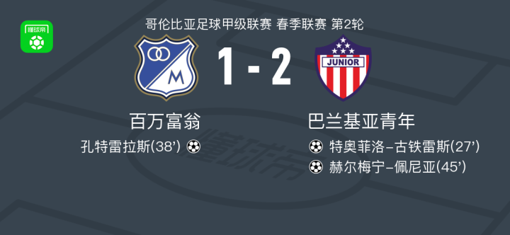 北京时间1月26日,哥伦比亚足球甲级联赛春季联赛第二轮,百万富翁主场对阵巴兰基亚青年。特奥菲洛-古铁雷斯率先破门,随后孔特雷拉斯为百万富翁扳平比分,上半场结束前赫尔梅宁-佩尼亚破门完成反超。最终,百万富翁1比2不敌巴兰基亚青年。