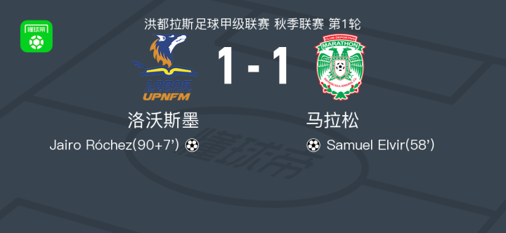 北京时间1月26日,洪都拉斯足球甲级联赛秋季联赛第1轮,洛沃斯墨主场对阵马拉松。马拉松球员Samuel Elvir率先破门,随后洛沃斯墨球员Jairo Róchez扳平比分。最终双方以1比1战平。
