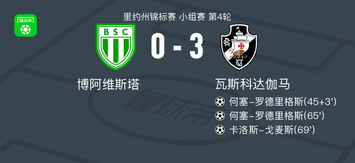 北京时间1月26日,里约州锦标赛小组赛第4轮,博阿维斯塔主场对阵瓦斯科达伽马。上半场补时阶段,何塞-罗德里格斯破门得分;随后,霍安-罗哈斯两次送出助攻,分别帮助何塞-罗德里格斯再入一球、卡洛斯-戈麦斯破门得分。最终,博阿维斯塔0–3不敌瓦斯科达伽马。