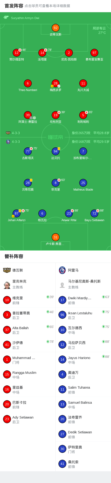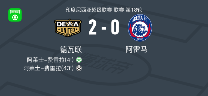 北京时间1月26日,印度尼西亚超级联赛第18轮,德瓦联主场对阵阿雷马。比赛第4分钟,阿莱士-费雷拉主罚点球命中;上半场临近结束前,梅西多罗送出助攻,阿莱士-费雷拉再入一球。最终德瓦联以2比0战胜阿雷马。