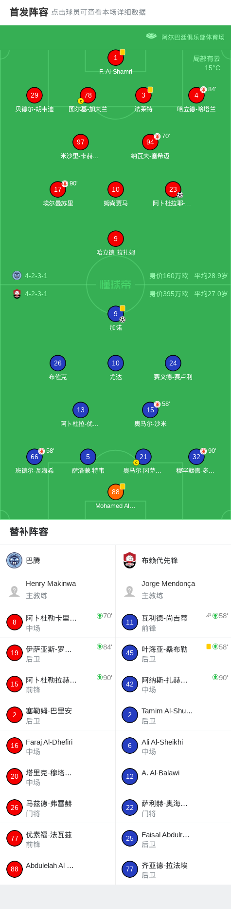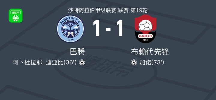 北京时间1月26日,沙特甲级联赛第19轮,巴腾主场迎战布赖代先锋。阿卜杜拉耶-迪亚比率先破门,为巴腾取得领先;随后加诺破门,为布赖代先锋扳平比分。最终双方以1比1握手言和。