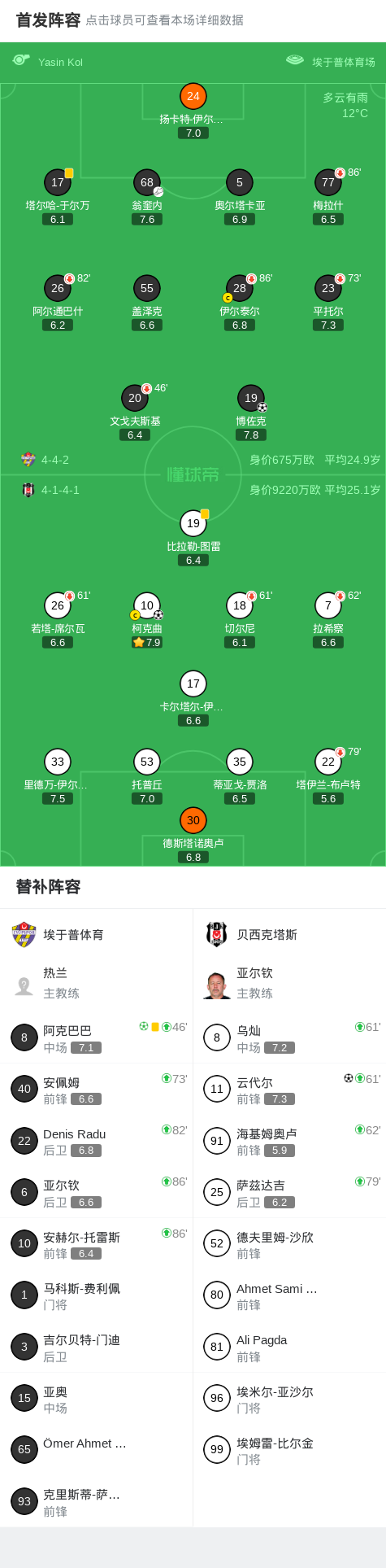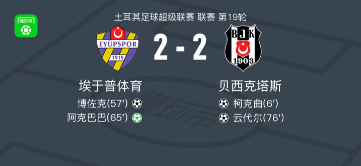 埃于普体育2-2贝西克塔斯,柯克曲首开记录,云代尔扳平