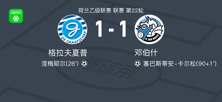 北京时间1月27日,荷兰乙级联赛第22轮,格拉夫夏普主场对阵邓伯什。涅梅耶尔接队友助攻破门,为格拉夫夏普首开纪录。随后,塞巴斯蒂安-卡尔松在比赛尾声阶段接队友助攻扳平比分。最终双方1比1战平。