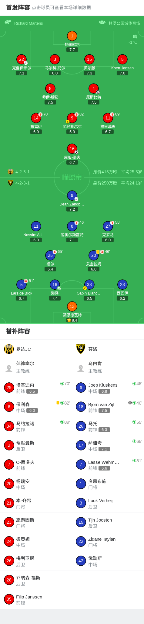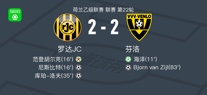北京时间1月27日,荷兰乙级联赛第22轮,罗达JC主场对阵芬洛。海泽主罚点球命中,为芬洛首开纪录。随后尼斯比特破门,为罗达JC扳平比分。克鲁伊弗尔送出助攻,库珀-洛夫破门,助罗达JC反超比分。终场前,Dean Zandbergen助攻Bjorn van Zijl破门,芬洛再度追平。最终双方以2比2握手言和。
