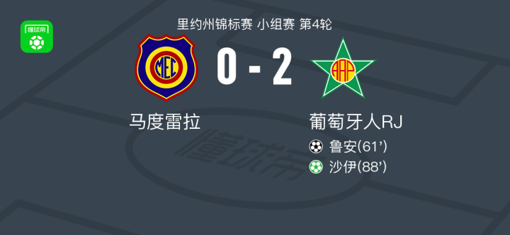 北京时间1月27日,里约州锦标赛小组赛第四轮,马度雷拉主场对阵葡萄牙人RJ。安德松-罗萨送出助攻,鲁安破门得分;随后沙伊主罚点球命中。最终,马度雷拉0比2不敌葡萄牙人RJ。