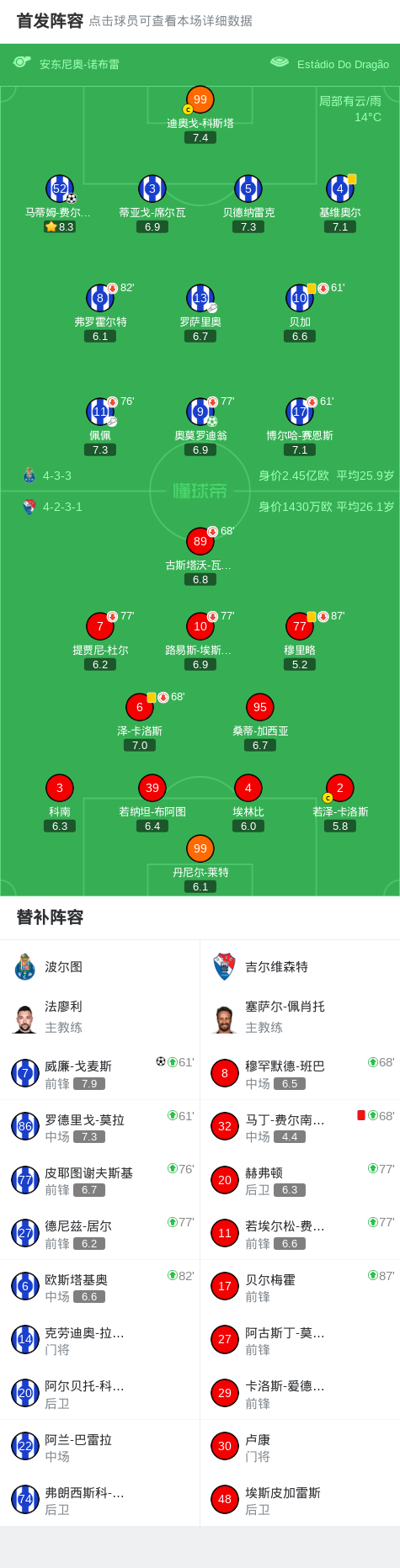 波尔图3-0大胜吉尔维森特,威廉-戈麦斯、马蒂姆-费尔南德斯破门