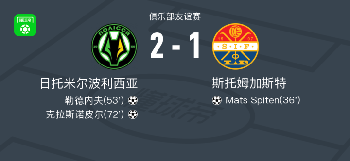 俱乐部友谊赛,日托米尔波利西亚对阵斯托姆加斯特。斯托姆加斯特由Mats Spiten率先破门,随后日托米尔波利西亚由勒德内夫扳平比分,克拉斯诺皮尔再入一球完成反超。最终日托米尔波利西亚以2比1取胜。