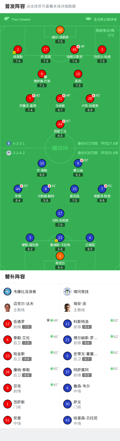 第72分钟,韦康比流浪者球员伍德罗打入一球。