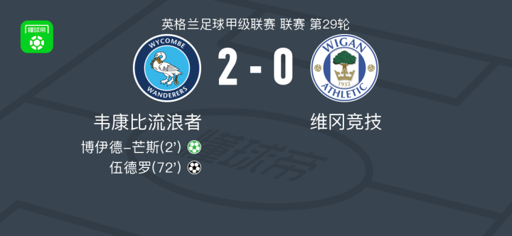 韦康比流浪者2-0维冈竞技,博伊德-芒斯建功,伍德罗锦上添花