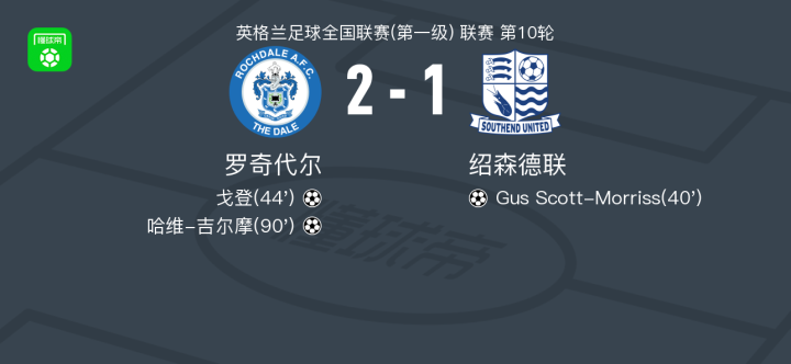 北京时间1月28日,英格兰足球全国联赛(第一级)第10轮,罗奇代尔主场对阵绍森德联。绍森德联由Gus Scott-Morriss率先破门;随后罗奇代尔由戈登扳平比分;比赛尾声阶段,哈维-吉尔摩攻入制胜一球。最终罗奇代尔以2比1战胜绍森德联。