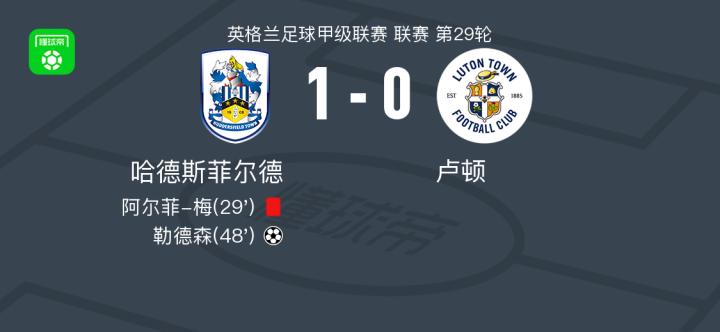 北京时间1月28日,英格兰足球甲级联赛第29轮,哈德斯菲尔德主场对阵卢顿。比赛中,哈德斯菲尔德球员阿尔菲-梅被罚离场。随后,勒德森破门得分。最终,哈德斯菲尔德以1比0战胜卢顿。
