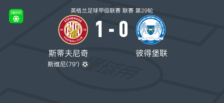 北京时间1月28日,英格兰足球甲级联赛第29轮,斯蒂夫尼奇主场迎战彼得堡联。哈维-怀特送出助攻,斯维尼破门得分。最终斯蒂夫尼奇以1比0战胜彼得堡联。