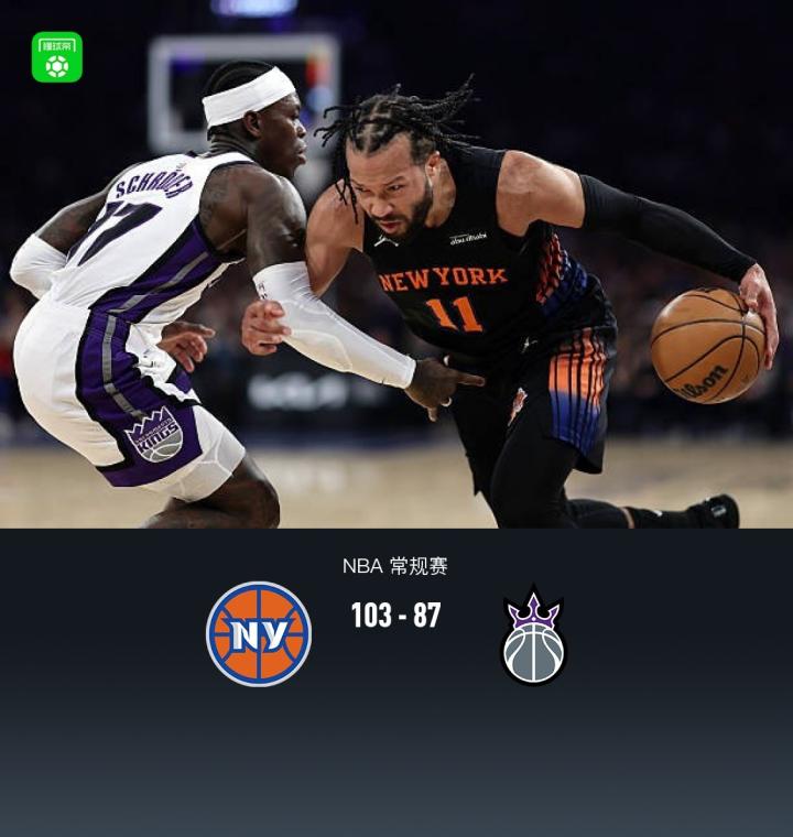 第四节尼克斯布伦森拿下11分,国王德罗赞拿下6分,最终尼克斯103-87战胜国王