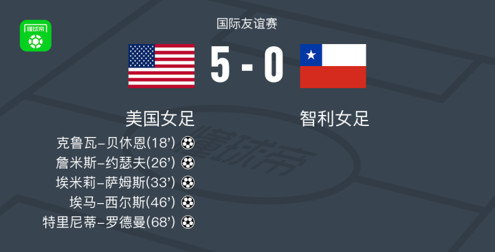 国际友谊赛,美国女足对阵智利女足。克鲁瓦-贝休恩率先破门,随后詹米斯-约瑟夫破门得分,埃米莉-萨姆斯接应助攻再入一球,紧接着埃马-西尔斯破门扩大优势,特里尼蒂-罗德曼最后完成破门。最终美国女足5–0战胜智利女足。