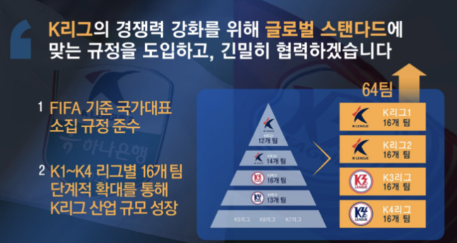 在郑梦奎的推动下,韩国足球联赛发生了历史性的变革,K3联赛从业余性质提升为半职业性质,2020年成立K4联赛,K3和K4内部施行升降级。2018年成立K6联赛,19年成立K5联赛,同时将17年成立的业余联赛改名为K7联赛。K5~K7三级联赛之间施行内部升降级。于是,韩国联赛的体制就变为了:K1和K2(职业联赛内部升降级),K3~K4(半职业联赛内部升降级),K5~K7(业余联赛内部升降级),三级联赛各玩各的,形成了一道奇葩的赛制。也就是说,K2、K4和K7的球队永远不用担心自己的“降级”,K3、K5的球队永远不要痴心妄想升级。