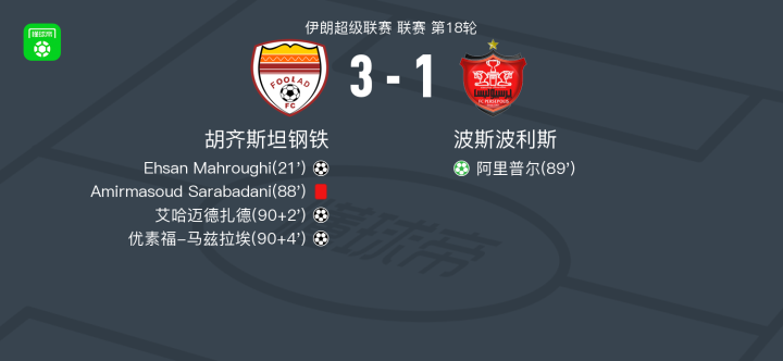 北京时间1月28日伊朗超级联赛 联赛 第18轮,胡齐斯坦钢铁主场对阵波斯波利斯。胡齐斯坦钢铁Ehsan Mahroughi破门,艾哈迈德扎德破门,优素福-马兹拉埃破门。波斯波利斯阿里普尔破门。最终比分胡齐斯坦钢铁 3-1 波斯波利斯。