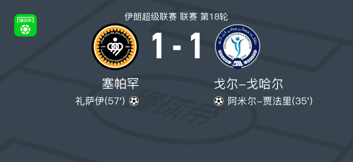 北京时间1月28日伊朗超级联赛 联赛 第18轮,塞帕罕主场对阵戈尔-戈哈尔。塞帕罕礼萨伊破门。戈尔-戈哈尔阿米尔-贾法里破门。最终比分塞帕罕 1-1 戈尔-戈哈尔。