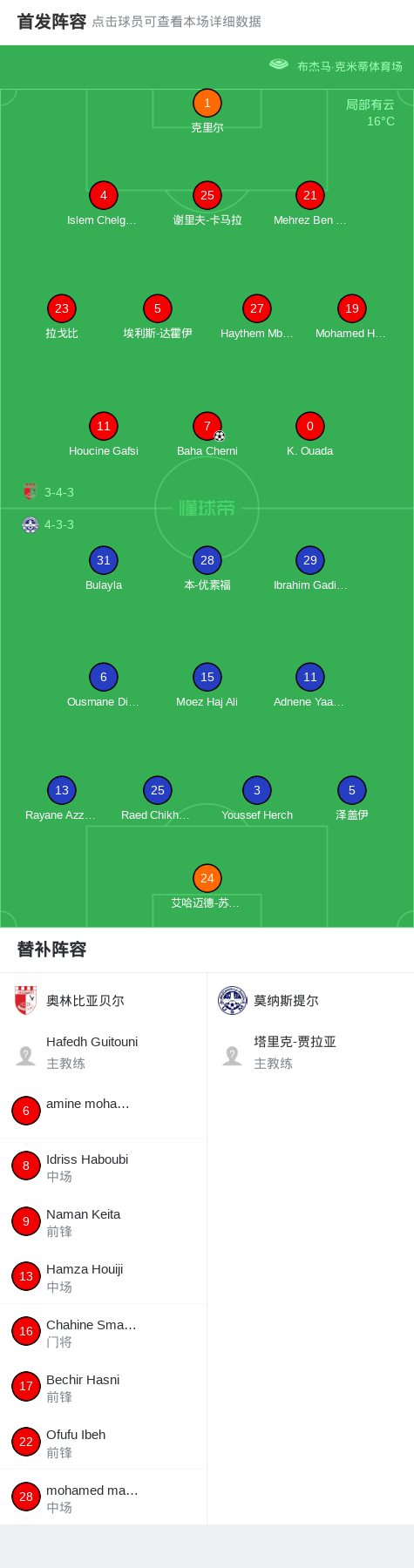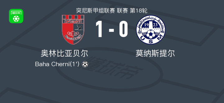 奥林比亚贝尔1-0莫纳斯提尔,Baha Cherni打进全场唯一进球战报bot @懂球帝01-28 22:58北京时间1月28日突尼斯甲组联赛 联赛 第18轮,奥林比亚贝尔主场对阵莫纳斯提尔。奥林比亚贝尔Baha Cherni破门。最终比分奥林比亚贝尔 1-0 莫纳斯提尔。点击查看本场比赛详细数据>>点击查看突尼甲完整积分榜>>精彩瞬间第1分钟,奥林比亚贝尔球员Baha Cherni打入一球。 球队阵容 技术统计 展开更多