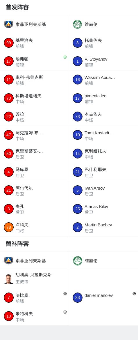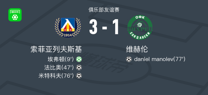 北京时间1月28日俱乐部友谊赛,索菲亚列夫斯基对阵维赫伦。索菲亚列夫斯基埃弗顿破门,法比奥破门,米特科夫破门。维赫伦daniel manolev破门。最终比分索菲亚列夫斯基 3-1 维赫伦。