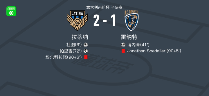 北京时间1月28日意大利丙组杯 半决赛,拉蒂纳对阵雷纳特。拉蒂纳杜图破门,帕里吉破门。雷纳特博内蒂破门。最终比分拉蒂纳 2-1 雷纳特。