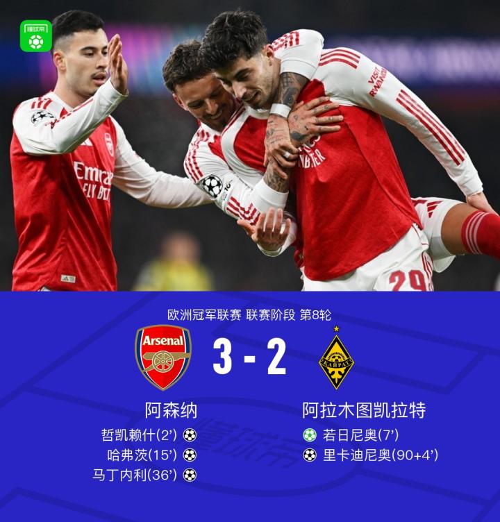 北京时间1月29日欧洲冠军联赛 联赛阶段 第8轮,阿森纳对阵阿拉木图凯拉特。上半场哲凯赖什破门,哈弗茨建功,马丁内利得分,若日尼奥点射,下半场最后时刻里卡迪尼奥破门。最终比分阿森纳 3-2 阿拉木图凯拉特全胜出线。