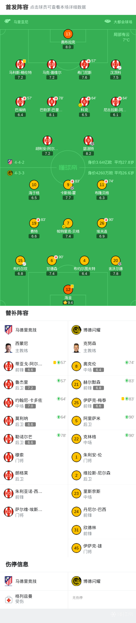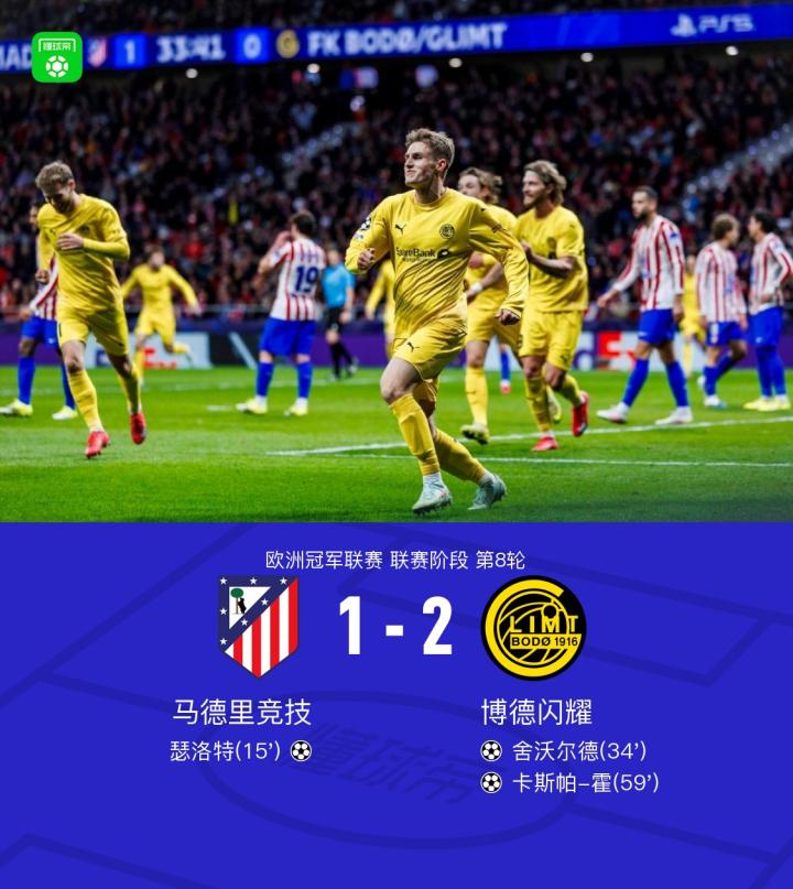 马竞1-2遭博德闪耀逆转,两队均战附加赛,卡斯帕-霍制胜