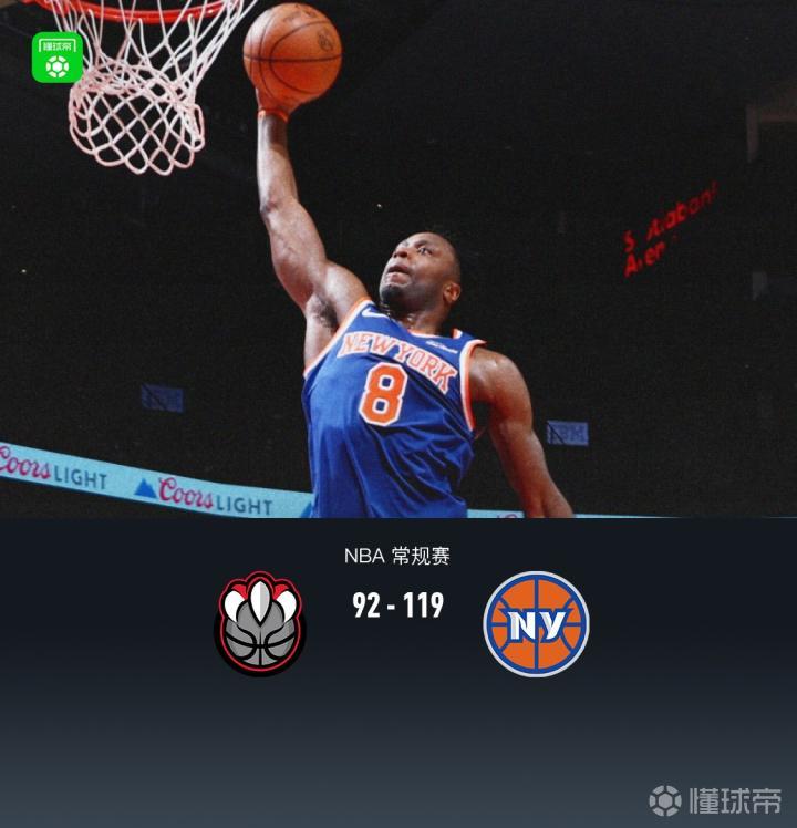 第四节猛龙马穆凯拉什维利拿下7分,尼克斯约什-哈特拿下11分,最终猛龙92-119不敌尼克斯