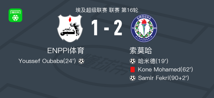 北京时间1月29日埃及超级联赛 联赛 第16轮,ENPPI体育主场对阵索莫哈。ENPPI体育Youssef Oubaba破门。索莫哈哈米德破门,Samir Fekri破门。最终比分ENPPI体育 1-2 索莫哈。