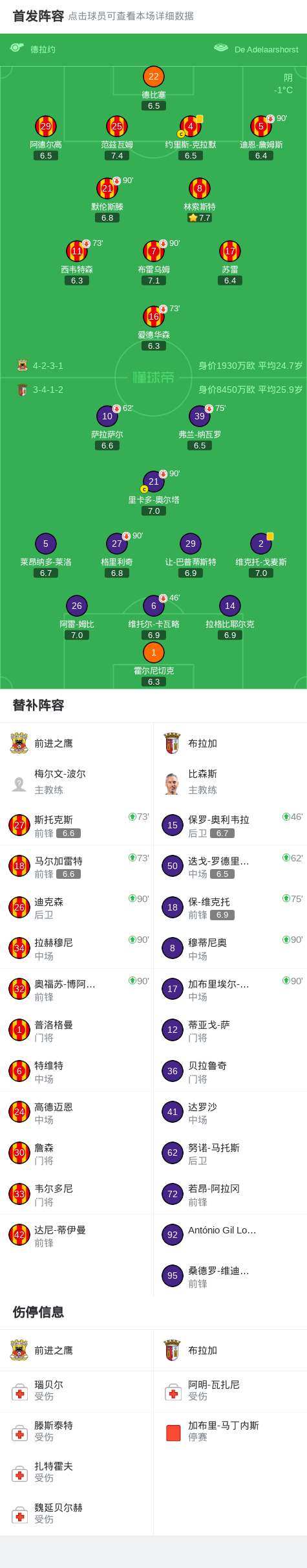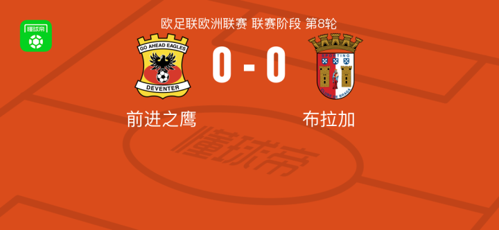 前进之鹰0-0布拉加,双方握手言和战报bot @懂球帝01-30 05:56北京时间1月30日欧足联欧洲联赛 联赛阶段 第8轮,前进之鹰对阵布拉加。最终比分前进之鹰 0-0 布拉加。点击查看本场比赛详细数据>>点击查看欧联完整积分榜>> 球队阵容 技术统计 展开更多