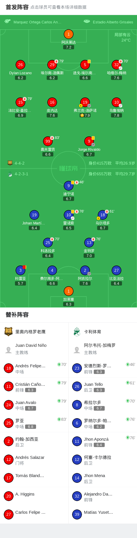 里奥内格罗老鹰2-1卡利体育,弗兰克-洛萨诺、Jorge Rivaldo破门